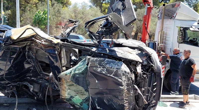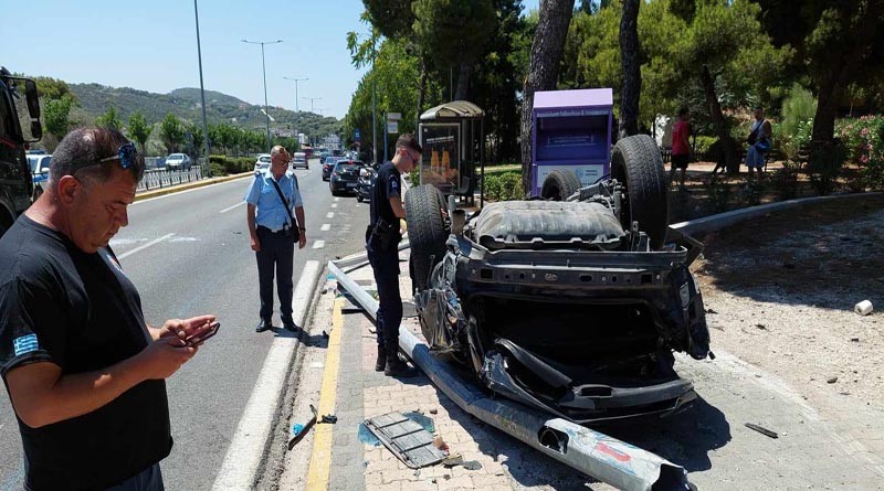 Η σύγκρουση ήταν τόσο σφοδρή που το ένα από τα αυτοκίνητα βρέθηκε αναποδογυρισμένο στο απέναντι πεζοδρόμιο.