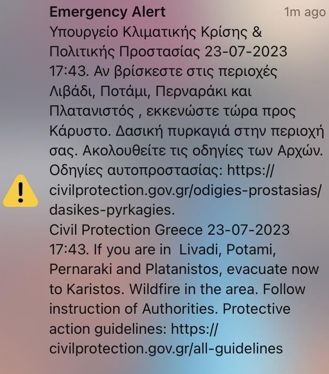 «Αν βρίσκεστε στις περιοχές Λιβάδι, Ποτάμι, Περναράκι και Πλατάνιστο εκκενώστε τώρα προς Κάρυστο», αναφέρει η ειδοποίηση.