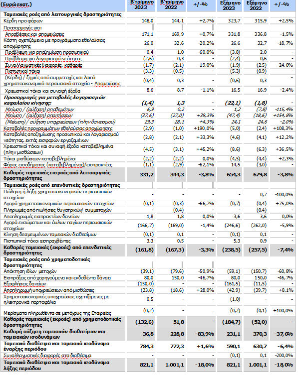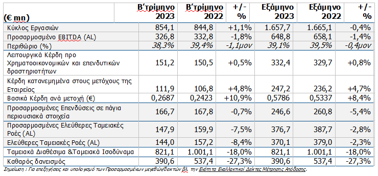 Οι προσαρμοσμένες ελεύθερες ταμειακές ροές μετά από μισθώσεις διαμορφώθηκαν σε €147,9 εκατ. το Β’ τρίμηνο του 2023, μειωμένες κατά 7,5% σε ετήσια βάση, ενώ οι ελεύθερες ταμειακές ροές μετά από μισθώσεις διαμορφώθηκαν σε €144,0 εκατ., μειωμένες κατά 8,4% σε σύγκριση με το Β’ τρίμηνο του 2022, αποτυπώνοντας τη χαμηλότερη κερδοφορία στη Ρουμανία.