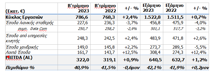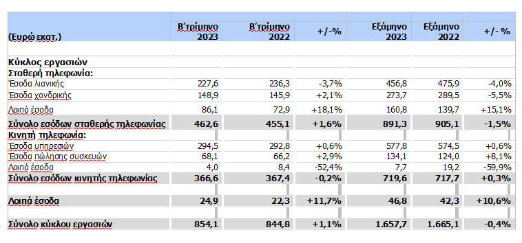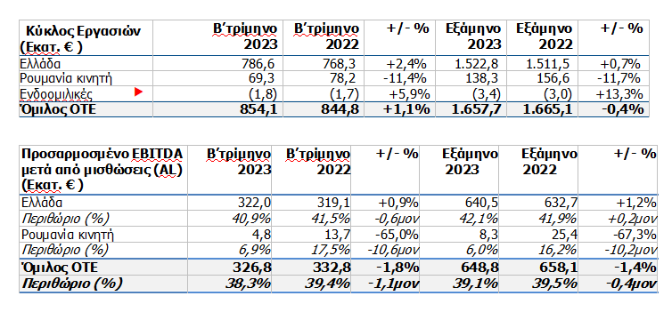 Το Β’ τρίμηνο του 2023, τα ενοποιημένα έσοδα του Ομίλου OTE αυξήθηκαν κατά 1,1% και διαμορφώθηκαν σε €854,1 εκατ. Στην Ελλάδα, τα έσοδα αυξήθηκαν κατά 2,4% στα €786,6 εκατ., καθώς η πτώση στις υπηρεσίες λιανικής σταθερής αντισταθμίστηκε από τις ισχυρές επιδόσεις στην κινητή και στις υπηρεσίες ICT. Στην Ρουμανία, τα έσοδα μειώθηκαν κατά 11,4% και διαμορφώθηκαν στα €69,3 εκατ., αντανακλώντας σε μεγάλο βαθμό, όπως και στο προηγούμενο τρίμηνο, την παύση της παροχής υπηρεσιών MVNO σε πελάτες FMC, που άρχισε να φθίνει το δεύτερο μισό του 2022, προωθητικές ενέργειες για τη συγκράτηση της πελατειακής βάσης, και την επίδραση από τη μείωση στα τέλη τερματισμού κινητής τηλεφωνίας.