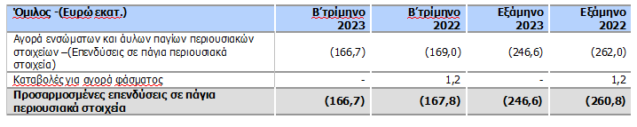 Οι προσαρμοσμένες επενδύσεις σε πάγια περιουσιακά στοιχεία ανήλθαν σε €166,7 εκατ., μειωμένες κατά 0,7% από το Β’ τρίμηνο του 2022. Εξαιρουμένης της επίδρασης των επενδύσεων που σχετίζονται με το τηλεοπτικό περιεχόμενο, που ήταν ιδιαίτερα υψηλές το Β’ τρίμηνο 2022 λόγω της απόκτησης των δικαιωμάτων μετάδοσης των αγώνων για το ελληνικό πρωτάθλημα ποδοσφαίρου, οι προσαρμοσμένες επενδύσεις θα ήταν αυξημένες κατά 15,6%. Οι επενδύσεις στην Ελλάδα και στην κινητή Ρουμανίας διαμορφώθηκαν σε €157,9 εκατ. και €8,8 εκατ. αντίστοιχα.