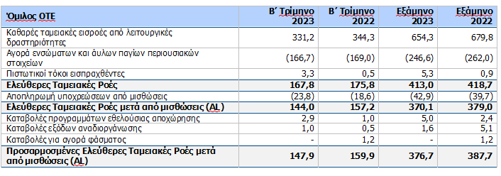 Για το 2023, η διοίκηση του ΟΤΕ διατηρεί τον στόχο για τις ελεύθερες ταμειακές ροές στα €500 εκατ. περίπου, ως αποτέλεσμα υψηλότερων πληρωμών φόρου εισοδήματος συγκριτικά με το 2022, χαμηλότερων χρηματοοικονομικών εξόδων, σταθερών επενδύσεων και καλύτερων λειτουργικών επιδόσεων στην Ελλάδα. Οι επενδύσεις του Ομίλου για το 2023 αναμένεται να παραμείνουν σταθερές, περίπου στα €640 εκατ., καθώς η εταιρεία συνεχίζει την ανάπτυξη των υποδομών FTTH.