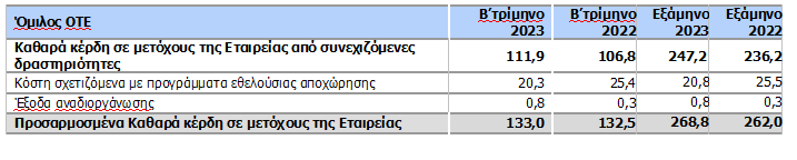 Τα προσαρμοσμένα καθαρά κέρδη που κατανέμονται στους μετόχους της Εταιρείας διευκολύνουν στην ανάλυση της καθαρής κερδοφορίας του Ομίλου εξαιρουμένης της επίδρασης μη επαναλαμβανόμενων ή μη περιοδικών στοιχείων και στη σύγκριση των επιδόσεων σε σχέση με προηγούμενες περιόδους. Για την αντίστοιχη περίοδο του 2023 και την συγκρινόμενη περίοδο του 2022, έχει ληφθεί υπόψη η επίδραση από τα ακόλουθα: κόστη σχετιζόμενα με προγράμματα εθελούσιας αποχώρησης και έξοδα αναδιοργάνωσης.