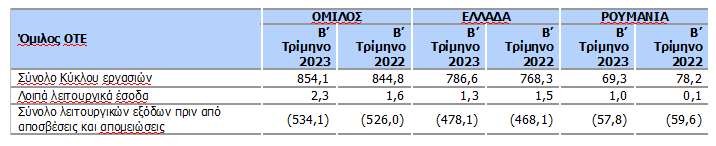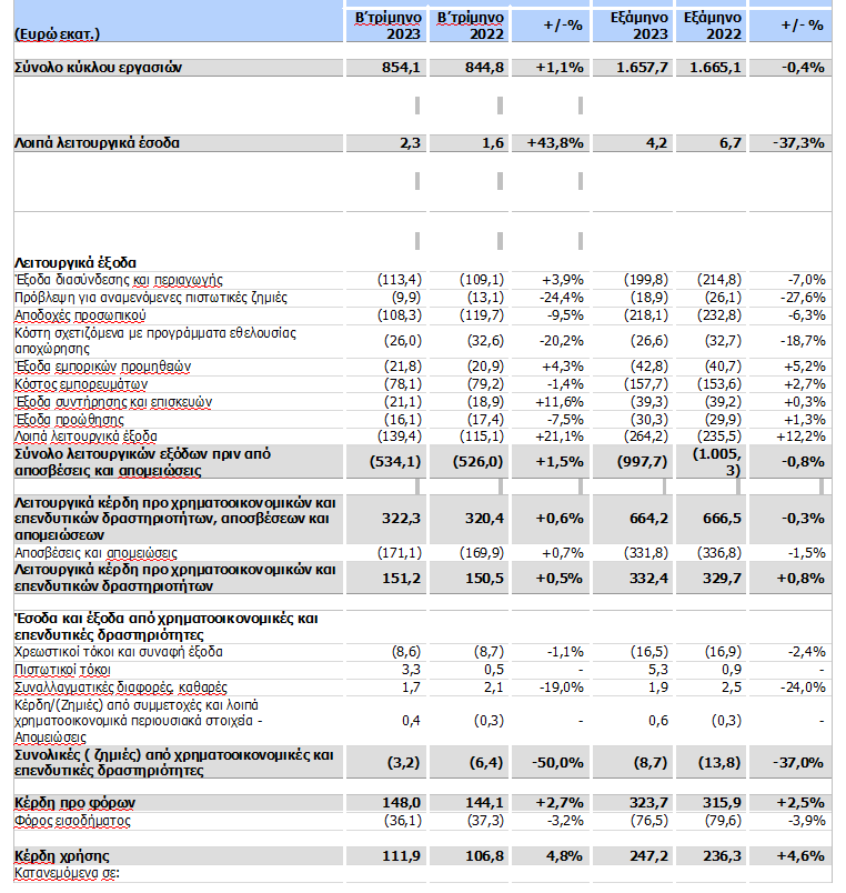 Τα συνολικά λειτουργικά έξοδα του Ομίλου, εξαιρουμένων των αποσβέσεων, των απομειώσεων και των επιβαρύνσεων που σχετίζονται με κόστη αναδιοργάνωσης (κυρίως Προγράμματα Εθελούσιας Αποχώρησης), αυξήθηκαν κατά 2,9% σε σύγκριση με το Β’ τρίμηνο του 2022 και διαμορφώθηκαν σε €507,3 εκατ., καθώς η αύξηση στα άμεσα κόστη λόγω της ενίσχυσης των εσόδων αντιστάθμισε τις εξοικονομήσεις σε άλλες περιοχές κόστους, ιδίως στα έξοδα προσωπικού.