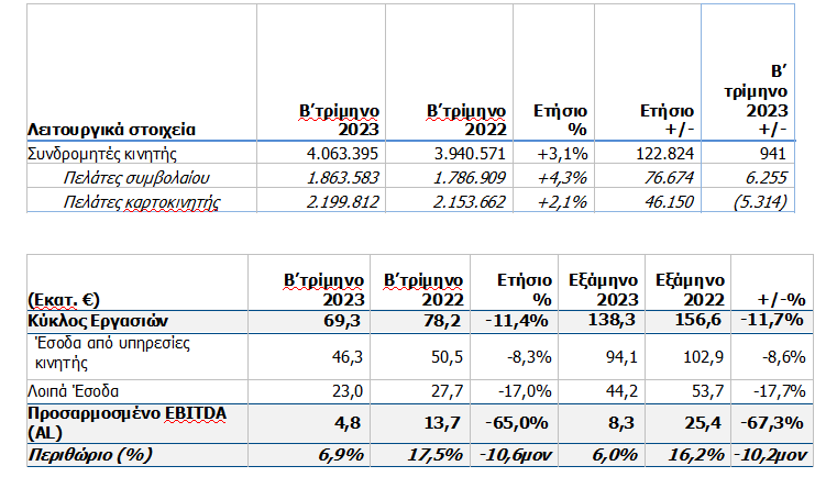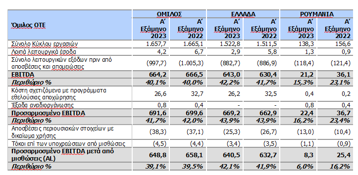 Η προσαρμοσμένη κερδοφορία EBITDA (AL) του Ομίλου μειώθηκε κατά 1,8% στα €326,8 εκατ., με το περιθώριο να διαμορφώνεται σε 38,3%. Στην Ελλάδα, η προσαρμοσμένη κερδοφορία EBITDA (AL) σημείωσε αύξηση 0,9%, στα €322,0 εκατ., με ισχυρό περιθώριο EBITDA 40,9%. Στην Ρουμανία, η προσαρμοσμένη κερδοφορία EBITDA (AL) διαμορφώθηκε στα €4,8 εκατ. μειωμένη κατά €8,9 εκατ., μερικώς οφειλόμενη στην παύση των δραστηριοτήτων MVNO, στο υψηλότερο κόστος ενέργειας, λόγω άρσης της κρατικής ρύθμισης στις τιμές ενέργειας από τις αρχές του 2023 και σε ορισμένες προσαρμογές στα λειτουργικά έξοδα το προηγούμενο έτος.