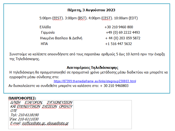 Αθήνα, 3 Αυγούστου 2023 – Οργανισμός Τηλεπικοινωνιών της Ελλάδος Α.Ε.