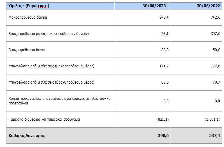 Ο καθαρός δανεισμός του Ομίλου στις 30 Ιουνίου 2023 ήταν €390,6 εκατ., μειωμένος κατά 27,3% σε σχέση με το Β’ τρίμηνο 2022. Ο καθαρός δανεισμός του Ομίλου αντιστοιχεί σε 0,3 φορές το ετήσιο προσαρμοσμένο ΕΒΙTDA (AL). Ο οίκος αξιολόγησης Standard & Poor’s προχώρησε πρόσφατα σε αναβάθμιση της πιστοληπτικής αξιολόγησης του ΟΤΕ σε “ΒΒΒ+” με σταθερή προοπτική.