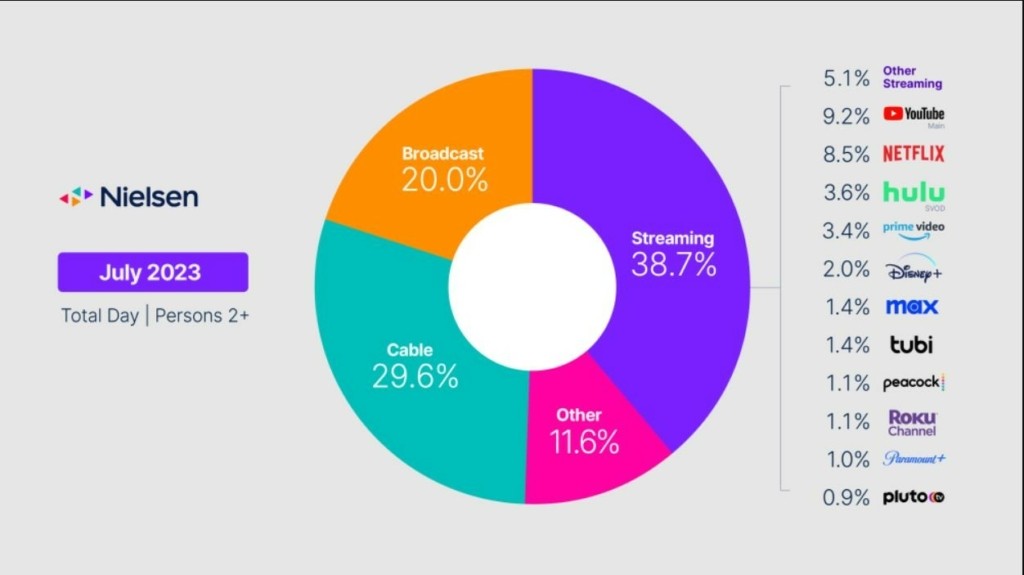 Εν τω μεταξύ οι ιντερνετικές πλατφόρμες διαρκούς ροής οπτικοακουστικού περιεχομένου (όπως το YouTube, το Netflix, το Hulu, το Amazon Prime, το Disney+ κ.ά.) έφθασαν να αποσπάσουν μερίδιο 38,7%, το οποίο αποτελεί ρεκόρ συνολικής χρήσης στις ΗΠΑ, το μεγαλύτερο της κατηγορίας έως τώρα σύμφωνα με την έρευνα- έκθεση The Gauge της Nielsen η οποία διενεργείται σε μηνιαία βάση.