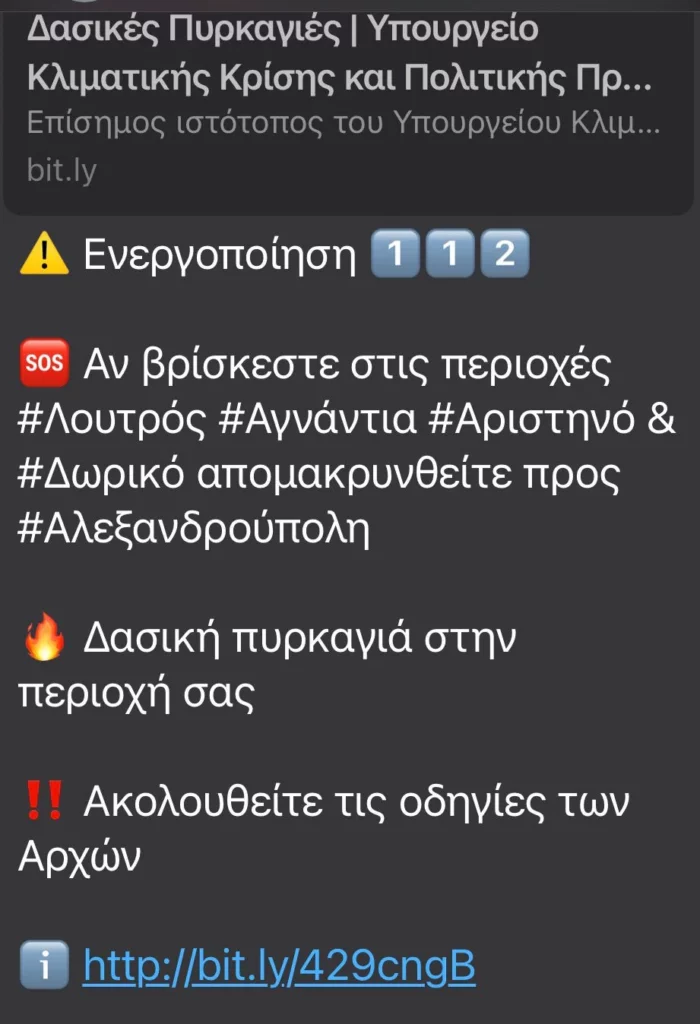 «Αν βρίσκεστε στις περιοχές Λουτρός Αγνάντια, Αριστηνό και Δωρικό απομακρυνθείτε προς Αλεξανδρούπολη», ήταν το μήνυμα που έλαβαν στα κινητά τους οι κάτοικοι λίγο πριν από τις 5 το απόγευμα του Σαββάτου.