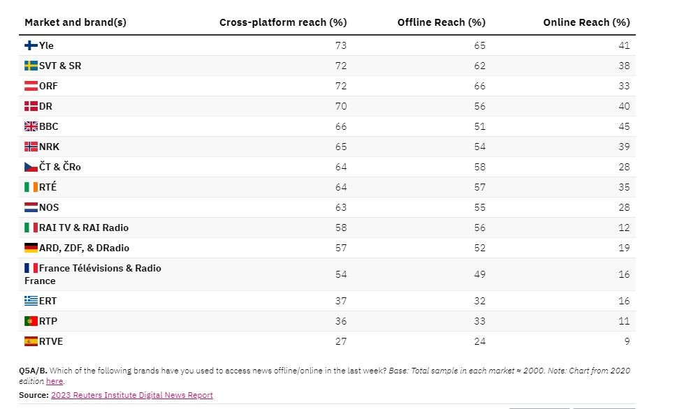 Κορυφαία σε επισκεψημότητα είναι η φινλανδική ραδιοτηλεόραση (Yle), δεύτερη στην κατάταξη είναι η δημόσια ραδιοτηλεόραση της Σουηδίας (SVT & SR), ακολουθούν εκείνες της Αυστρίας και της Δανίας. Την κορυφαία πεντάδα συμπληρώνει το BBC το οποίο όμως πριν από μια πενταετία ήταν στην πρώτη θέση (με ποσοστά 78% σε cross platform, 68% στο offline και 50% στο online). Εντυπωσιακή είναι η υποχώρηση στους δείκτες του δημόσιου ραδιοτηλεοπτικού φορέα της Γερμανίας (ARD, ZDF & DRadio) ο οποίος το 2023 είναι στην 11η θέση από την δεύτερη που είχε διακριθεί το 2019 (με ποσοστά προτίμησης 69%, 66%, 17%, αντιστοίχως).