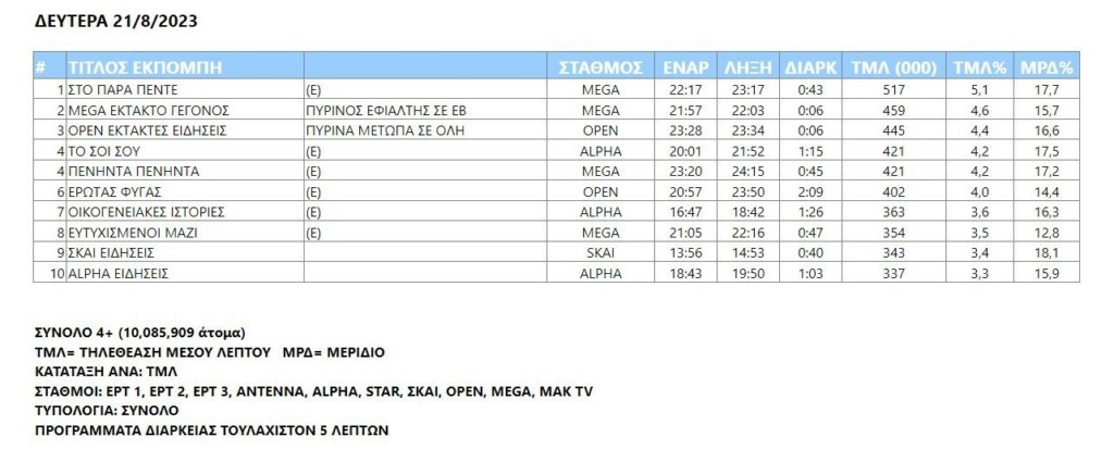 Το 40% του Top 10 της Δευτέρας αποτέλεσαν δελτία ειδήσεων με τις εξελίξεις από τις νέες σαρωτικές πυρκαγιές, κυρίως όμως εκείνης στο Έβρο.