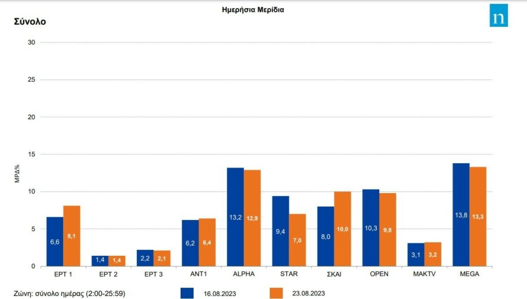 Πάνω από δυόμιση μονάδες αυξήθηκε το μερίδιο του Alpha, ενώ ο ΣΚΑΪ ήταν τριτη επιλογή της ημέρας αν και με απώλειες στην απόδοση του. Το Open εμφάνισε κάμψη και είχε την Τετάρτη το τέταρτο σε μέγεθος κομμάτι της πίτας, σύμφωνα με τα στοιχεία της Nielsen.