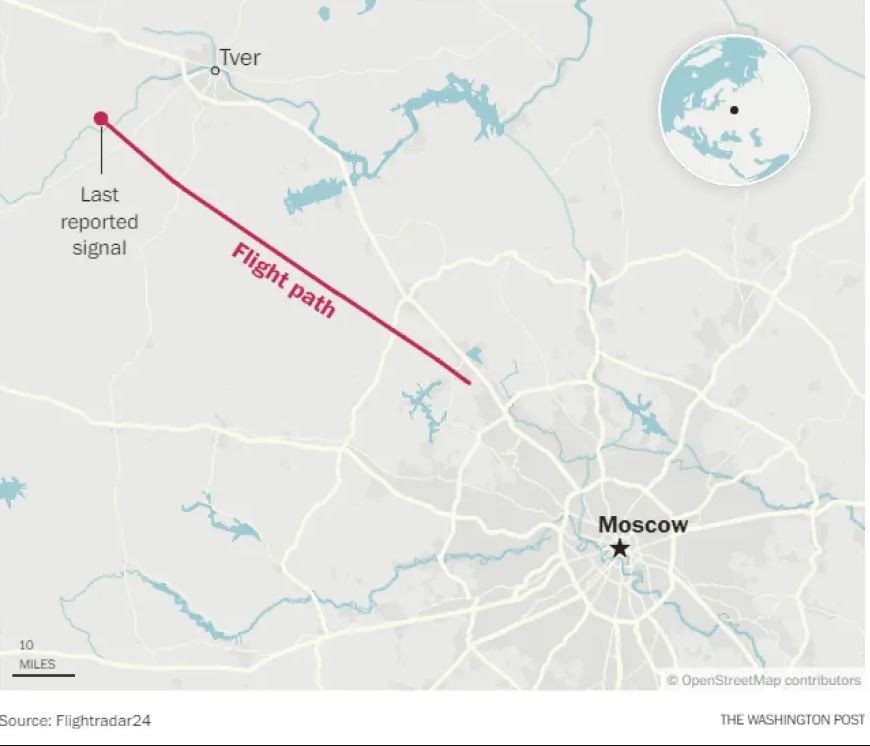 Το αεροσκάφος Embraer συνετρίβη στην περιοχή Τβερ ενώ πετούσε μεταξύ Μόσχας και Αγίας Πετρούπολης. Βίντεο που αναρτήθηκε στο διαδίκτυο φαίνεται ότι έδειχνε το μικρό αεροσκάφος να ακολουθεί ένα σύννεφο καπνού πριν προσκρούσει στο έδαφος και ξεσπάσει στις φλόγες.