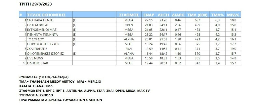 Στις άλλες θέσεις, χωρίς ιδιαίτερες μεταβολές, εμφανίστηκαν σχεδόν τα ίδια προγράμματα χθες. Ωστόσο νέες εμφανίσεις σημειώθηκαν από τη Nielsen και δεν ήταν άλλες από την εκπομπή «Live news» και το κεντρικό δελτίο ειδήσεων του Star.
