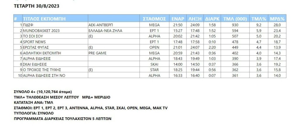 Κάλυψη αθλητικού γεγονότος και στην δεύτερη θέση του χθεσινού Top 10. Τον αγώνα κάτω από τα καλάθια μεταξύ των εθνικών ομάδων Ελλάδας- Νέας Ζηλανδίας, στο πλαίσιο του Παγκόσμιου Κυπέλλου μπάσκετ, είδαν σχεδόν 600.000 τηλεθεατές.