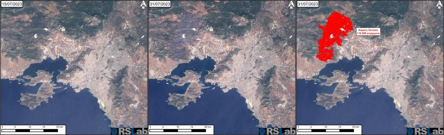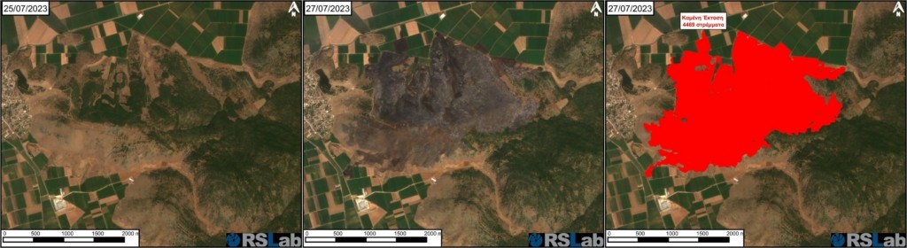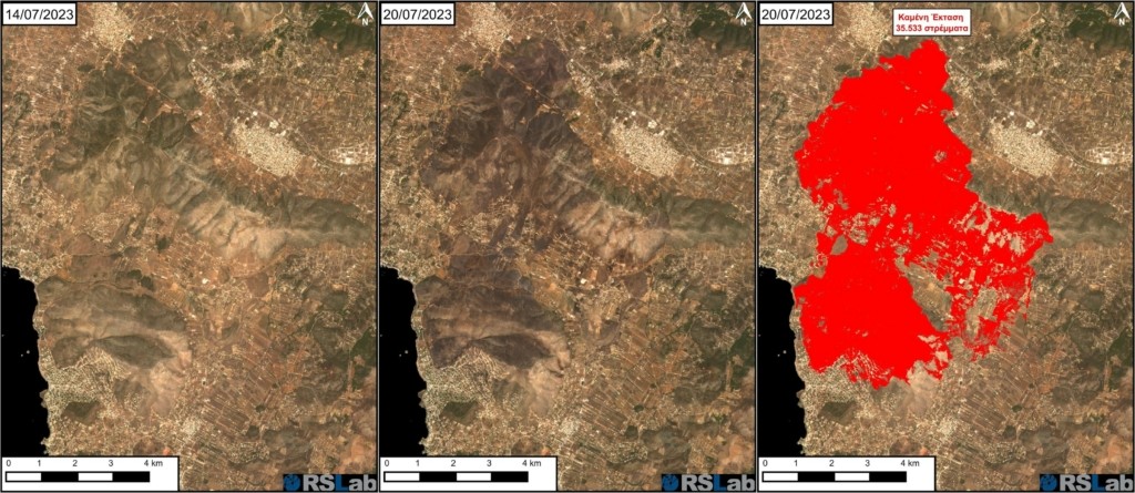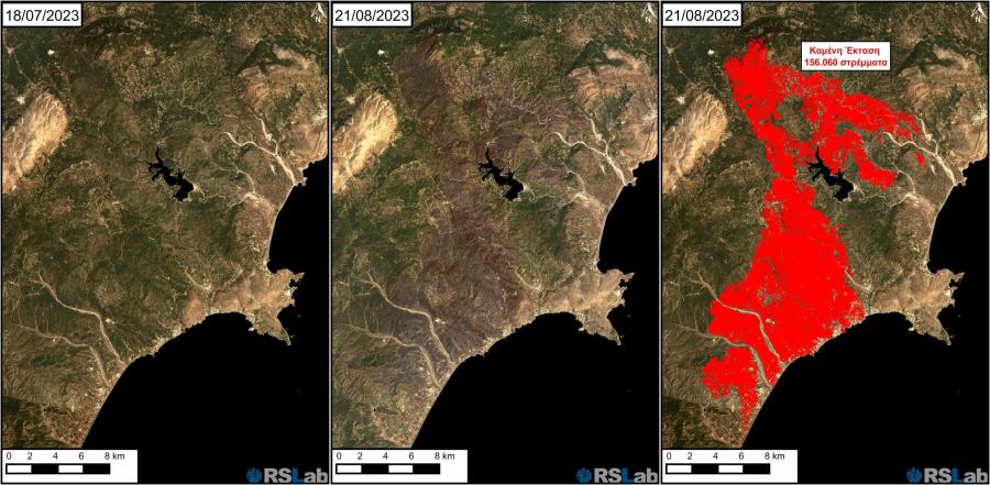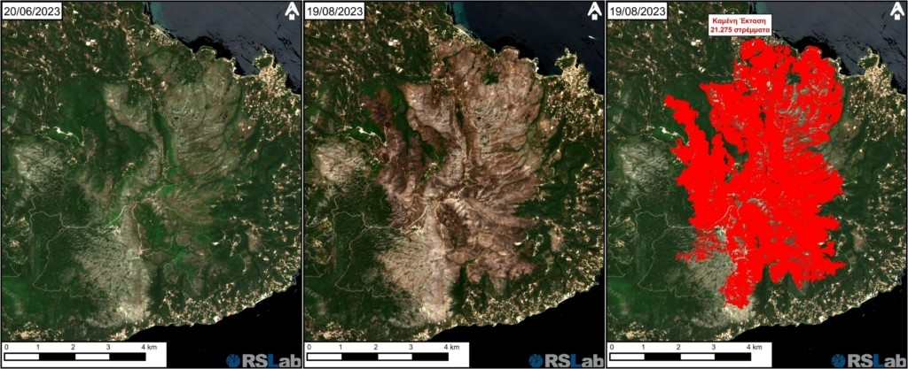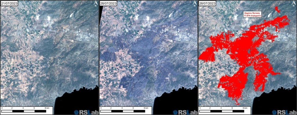 Όπως αναφέρεται, το εργαστήριο τηλεπισκόπησης (https://rslab.gr) του ΙΤΕ (Ίδρυμα Τεχνολογίας και Έρευνας) αξιοποιώντας τους αυτοματοποιημένους αλγορίθμους τεχνητής νοημοσύνης που έχει αναπτύξει για την ανάλυση και την επεξεργασία των δορυφορικών δεδομένων της NASA (Landsat-8/9), της ESA (Sentinel-2/3) και της Planet, εντόπισε και κατέγραψε με υψηλή ακρίβεια τις μεγαλύτερες καμένες εκτάσεις σε όλη την Ελληνική επικράτεια: