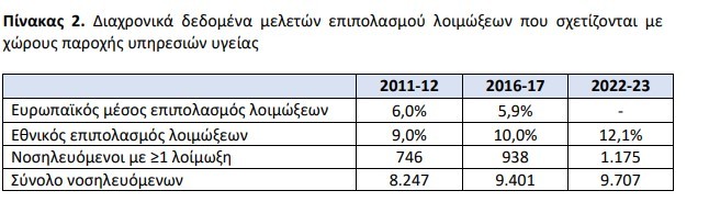 Σε μελέτη καταγραφής του σημειακού επιπολασμού των λοιμώξεων που συνδέονται με χώρους παροχής υγείας και της χρήσης αντιβιοτικών το διάστημα 2022-2023 ο επιπολασμός ανήλθε σε 12,1%, ενώ σε αντίστοιχη μελέτη το 2016-2017 ήταν 10,0%.