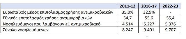 Όπως διαπιστώθηκε στην έρευνα η κατανάλωση αντιβιοτικών το 2022-2023 κυμάνθηκε σε παρόμοια επίπεδα με το 2016-2017 (55,4%) ήταν, όμως, σημαντικά μεγαλύτερος από τον αντίστοιχο ευρωπαϊκό μέσο όρο.
