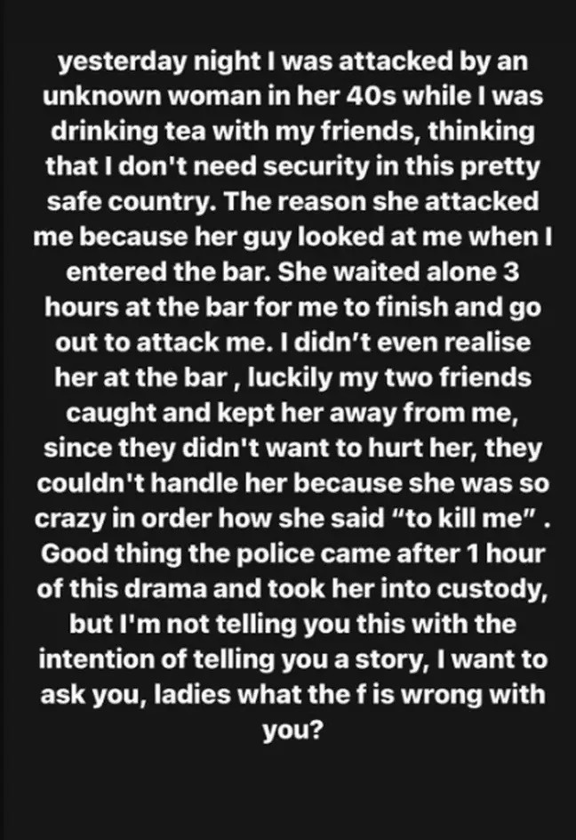 Σύμφωνα με όσα γράφει στο Instagram, μια γυναίκα την περίμενε για ώρες να βγει από το μπαρ όπου διασκέδαζε με φίλους για να της επιτεθεί. Ο λόγος; Επειδή την κοιτούσε επίμονα ο άνδρας της!