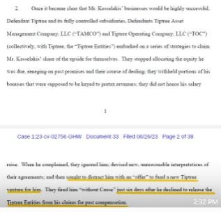 2. Όσον αφορά στη δήθεν απόλυσή του από την Tiptree, στις 13 Ιανουαρίου 2023 του ζητήθηκε να παραιτηθεί από τις αξιώσεις που είχε έναντι της εταιρείας για συμφωνημένες και μη καταβεβλημένες αμοιβές του. Επειδή ο κ. Κασσελάκης αρνήθηκε να “προσαρμόσει” τις απαιτήσεις του, η Τiptree επανήλθε στις 16.01.2023 με νέα δελεαστική πρόταση/προσφορά συνεργασίας, η οποία συνίστατο στην ανάθεση σε εκείνον νέου διευρυμένου επενδυτικού project πολλών εκατομμυρίων δολαρίων. Διευκρινίζεται ότι και αυτή η πρόταση έγινε στο πλαίσιο των εξωδικαστικών συζητήσεων των δύο πλευρών αναφορικά με τα δεδουλευμένα του. Επειδή, ο κ. Κασσελάκης απέρριψε και αυτή την πρόταση, στις 13 Μαρτίου 2023 ο ίδιος κατέθεσε αγωγή ενώπιον των αμερικανικών δικαστηρίων για λήξη (“termination”) της συνεργασίας του με την Tiptree (βλ. συνημμένο Νο 2)».