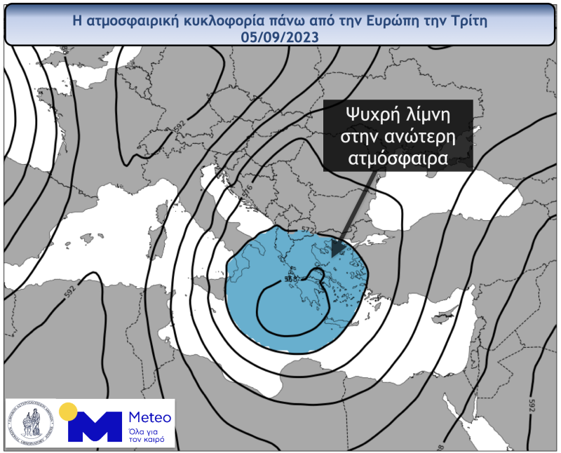 Αιτία για αυτή την επιδείνωση είναι η νοτιοδυτική κίνηση μιας ατμοσφαιρικής διαταραχής στην ανώτερη ατμόσφαιρα από τα Βόρεια Βαλκάνια προς τη χώρα μας και το Ιόνιο πέλαγος, όπου και αναμένεται να αποκοπεί από τη γενική ατμοσφαιρική κυκλοφορία (ψυχρή λίμνη) και αργά κινούμενη αναμένεται να διατηρηθεί στην ευρύτερη περιοχή της Κεντρικής Μεσογείου (Εικόνα 1).