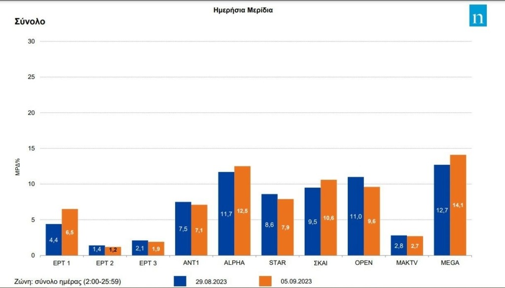 Από την άλλη, το Star πέρασε στην περιοχή κάτω από το 8%, ο ΑΝΤ1 είχε ανεπαίσθητη μεταβολή, αλλά με θετικό πρόσημο, ενώ κατά -0,3% ήταν τροποποιημένη η δυναμική της ΕΡΤ1.