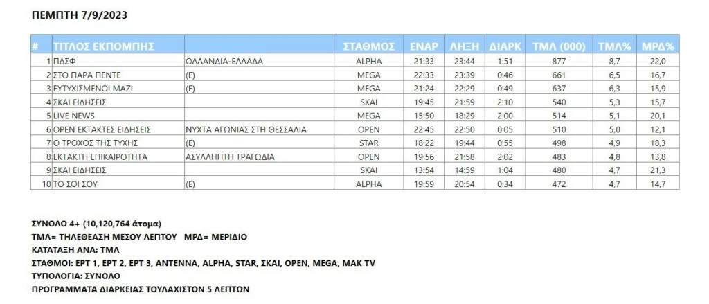 Στην πέμπτη θέση το «Live news» του Mega, διπλή εμφάνιση στη δεκάδα είχε το Open χάρη στα έκτακτα δελτία ειδήσεων με τα νεώτερα, ως τις ώρες που μεταδόθηκαν, από τη συμφορά που βρήκε τη Θεσσαλία, ενώ θέση στο ημερήσιο τηλεβαρόμετρο είχε, για μια ακόμη φορά, το μεσημεριανό δελτίο ειδήσεων του Σκάι.