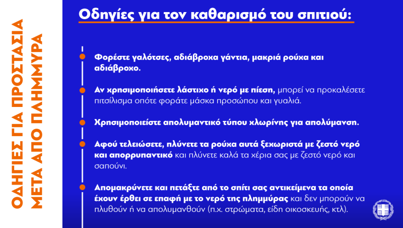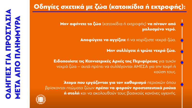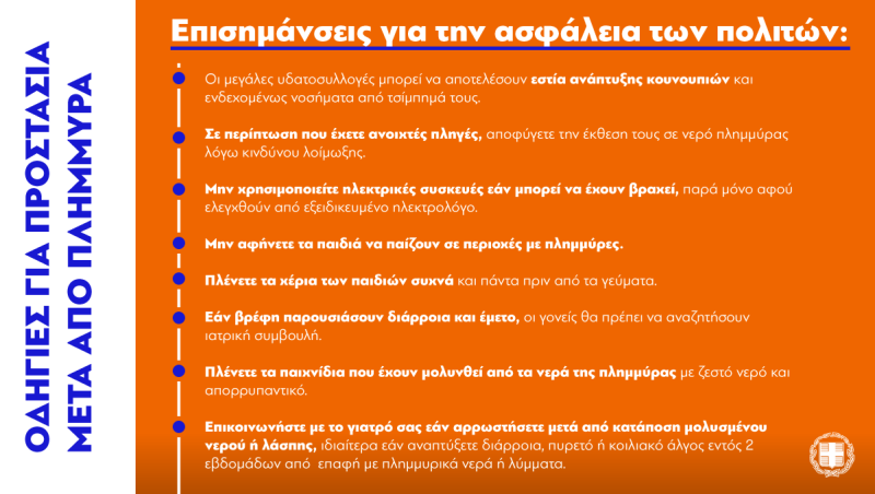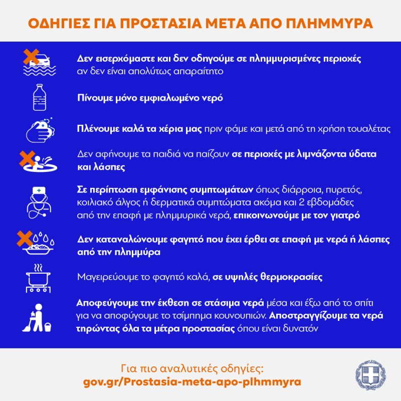 Παράλληλα, πρόσθεσε: «Είναι σημαντικό να γνωρίζουν οι πολίτες ότι σε όλες τις πληγείσες περιοχές διενεργούνται έλεγχοι από το αρμόδιο Εργαστήριο Δημόσιας Υγείας του Πανεπιστημίου Θεσσαλίας σε σχέση με την ποιότητα του νερού και οι κατά τόπους αρχές ανακοινώνουν πότε είναι ασφαλές να έχουν οι πολίτες πρόσβαση και να δώσουν σε κυκλοφορία το δίκτυο υδροδότησης. Άρα, μέχρι να έχουν οι πολίτες επίσημη ενημέρωση από τις τοπικές αρχές ότι το νερό της περιοχής είναι ασφαλές, θα πρέπει να χρησιμοποιούν εμφιαλωμένο νερό».