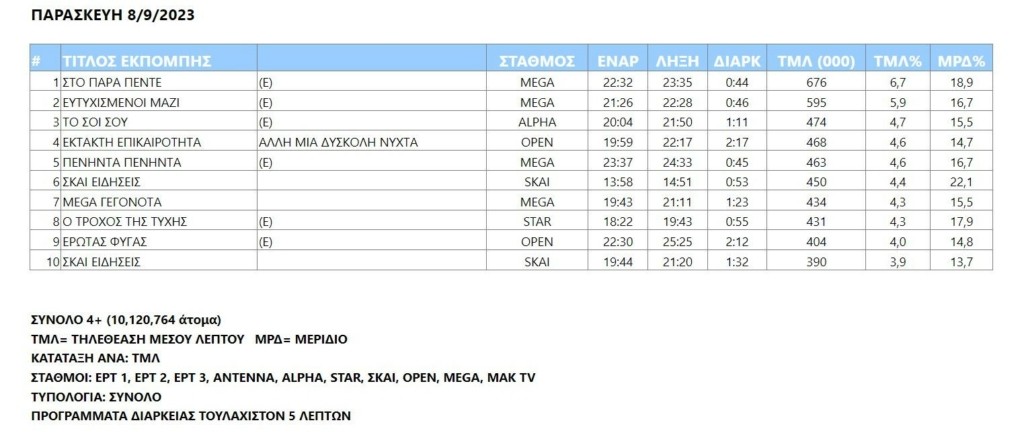 Open και Mega είχαν την ίδια τηλεθέαση την Παρασκευή