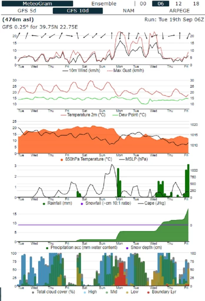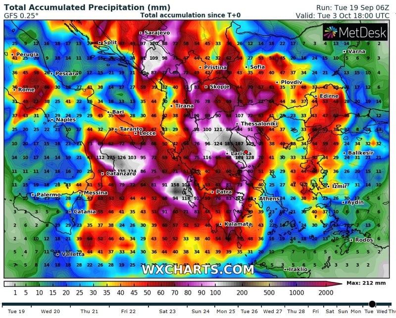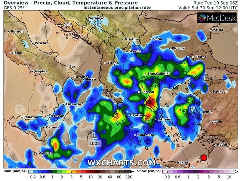 Χθες, τα μετεωρολογικά δεδομένα του μακροπρόθεσμου Αμερικανικού μοντέλου καιρού GFS έδειξαν πως η περιοχή της Θεσσαλίας αναμένεται να δεχτεί ως από 187 mm υετού (βροχής) κυρίως στα τέλη του Σεπτεμβρίου με αρχές Οκτωβρίου. Η πρόγνωση φέρει την πιθανότητα δημιουργίας Μεσογειακού Κυκλώνα ο οποίος θα επηρεάσει και τη χώρα μας στις 29 Σεπτεμβρίου.