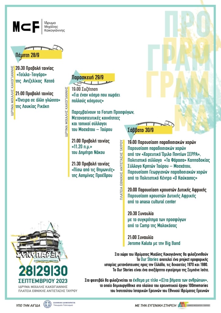 Το Ίδρυμα Μιχάλης Κακογιάννης διοργανώνει το Διαπολιτισμικό Φεστιβάλ «ΣΥΝΥΠΑΡΞΗ», με στόχο να τιμήσουμε την προσφυγική ιστορία του Ταύρου. Θέλουμε να αναδείξουμε την φιλοξενία της πόλης του Ταύρου προς τους συνανθρώπους είτε αυτοί είναι εσωτερικοί μετανάστες είτε ανήκουν στα σύγχρονα προσφυγικά ρεύματα. Επιδίωξή μας να γίνει φανερό ότι μέσω του πολιτισμού και των κοινών εμπειριών οι άνθρωποι μπορούν να έρθουν κοντά, να ζήσουν ειρηνικά και με αλληλεγγύη.