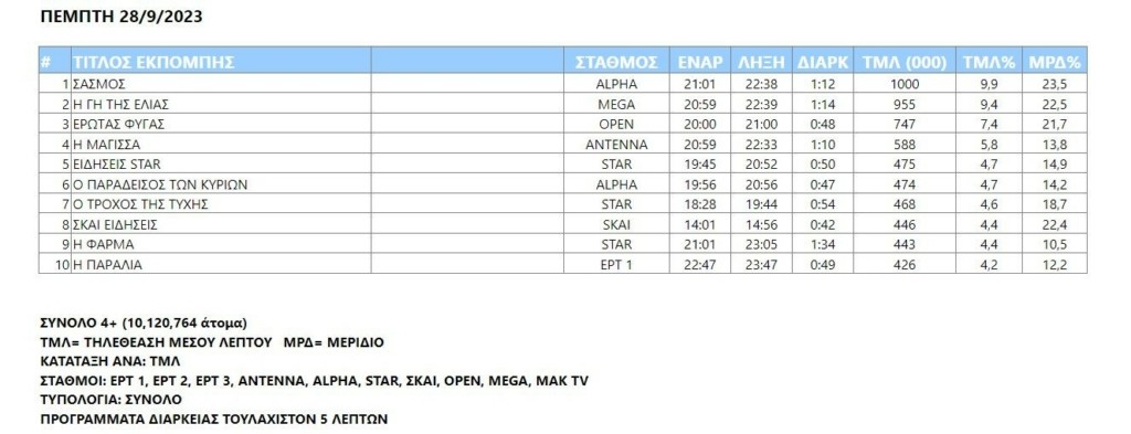 Στις επόμενες θέσεις η κατάταξη δεν άλλαξε, ήταν ίδια με εκείνη της Τετάρτης με τη διαφορά ότι στην πέμπτη βαθμίδα διακρίθηκε το κεντρικό δελτίο ειδήσεων του Star στη διάρκεια του οποίου μεταδόθηκε η πρώτη- τηλεοπτική και μετεκλογική- συνέντευξη του νέου προέδρου του ΣΥΡΙΖΑ-ΠΣ, Στέφανου Κασσελάκη.