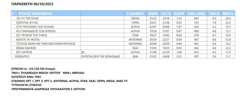 Με άνεση η σειρά «Η γη της ελιάς» επικράτησε του ανταγωνισμού, όπως κάθε Παρασκευή. Απέναντι στη σειρά του Mega, ο Alpha αντιπαρέβαλε τις σειρές «Ο γιατρός» και «το προξενιό της Ιουλίας». Και οι δύο σειρές του καναλιού της Κάτω Κηφισιάς ήταν στις 10 δημοφιλέστερες της ημέρας, είχαν όμως δυναμικές με τις οποίες- αν και ικανοποιητικές για τον σταθμό- δεν μπόρεσαν να απειλήσουν την πρωτοκαθεδρία της σειράς του Mega.