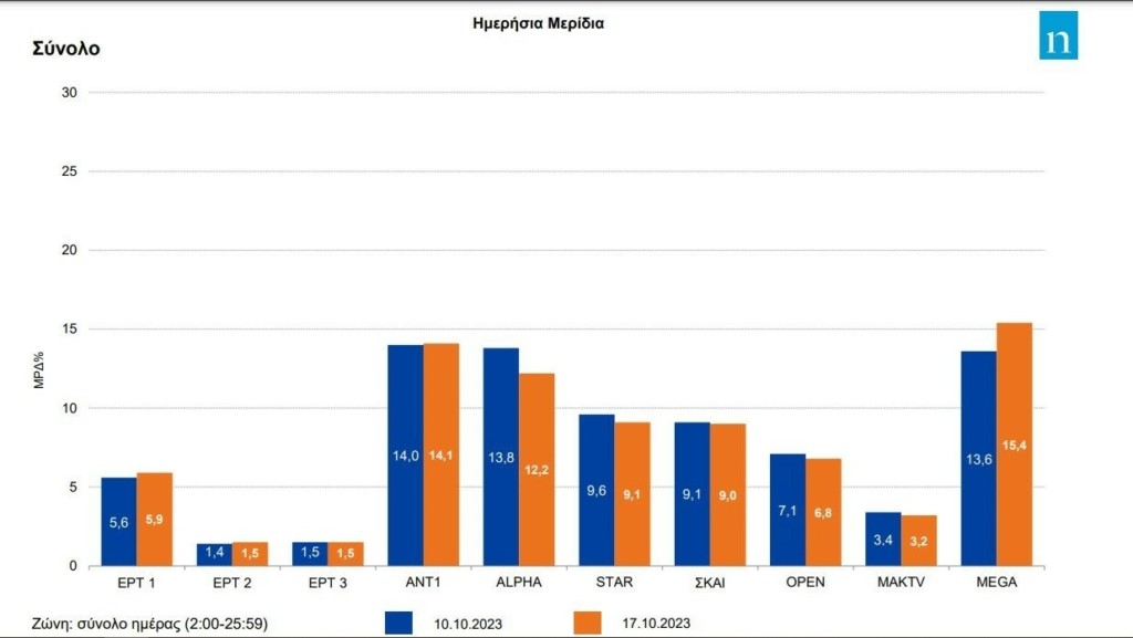 Το μεγαλύτερο κομμάτι από την πίτα τηλεθέασης της προηγούμενης ημέρας απέσπασε το Mega. Η μεγαλύτερη ένταση προτιμήσεων στο πρόγραμμα του καναλιού της Συγγρού παρατηρήθηκε από τα στοιχεία της Nielsen στη βραδινή ζώνη («H γη της ελιάς», «Το ναυάγιο»).