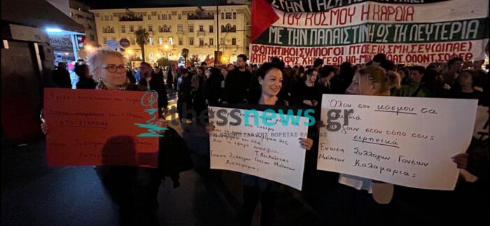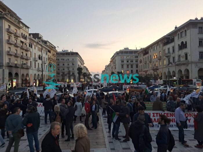 Μεγαλειώδης πορεία αλληλεγγύης στο κέντρο της Θεσσαλονίκη βρίσκεται σε εξέλιξη. Την υποστήριξη τους στον παλαιστινιακό λαό εξέφρασαν χιλιάδες πολίτες, μέλη του ΠΑΜΕ, συνδικάτα, φοιτητικοί σύλλογοι, κόμματα της εξωκοινοβουλευτικής Αριστεράς και διάφορες συλλογικότητες πραγματοποιώντας.
