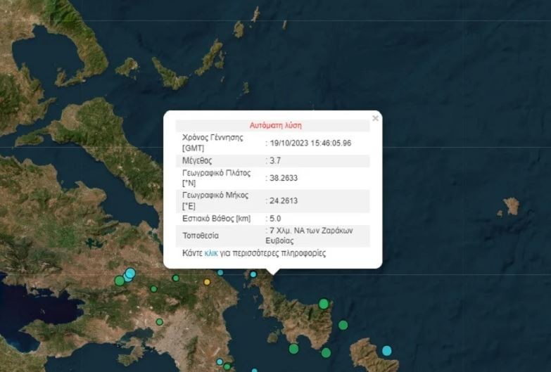 Ο σεισμός εκτιμάται ότι έγινε σε εστιακό βάθος 5 χλμ. Το επίκεντρο του σεισμού εντοπίζεται στα 7 χλμ ΝΑ των Ζαράκων στην Εύβοια.