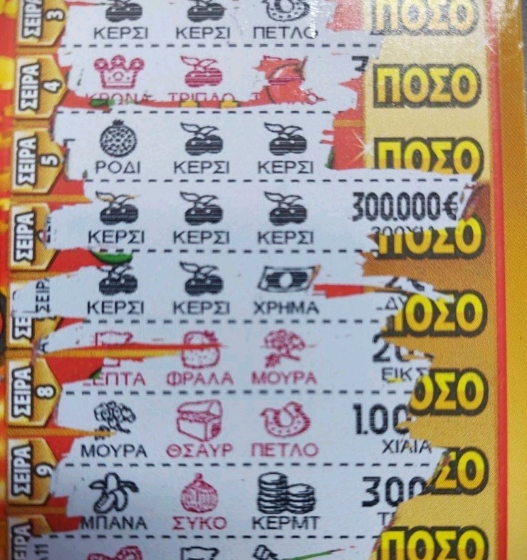 Όσον αφορά στον τυχερό λαχνό του ΣΚΡΑΤΣ «ΜΑΓΙΚΑ ΚΕΡΑΣΙΑ», που κόστισε μόλις 3 ευρώ, ο κ. Καλουτάς αναφέρει: «Ο μεγάλος νικητής βρήκε τα τρία μαύρα κεράσια πάνω στον τυχερό λαχνό και δίπλα το ποσό των 300.000 ευρώ».