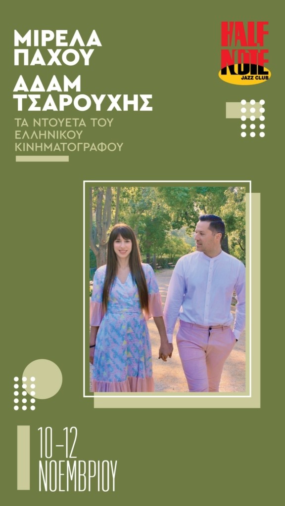 Η Μιρέλα Πάχου και ο Αδάμ Τσαρούχης μετά από ένα επιτυχημένο καλοκαίρι, μας προσκαλούν στις 10-11-12 Νοεμβρίου στο Half Note Jazz Club για να τραγουδήσουμε παρέα τα ντουέτα του ελληνικού κινηματογράφου αλλά και αγαπημένα τραγούδια από την προσωπική τους δισκογραφία.