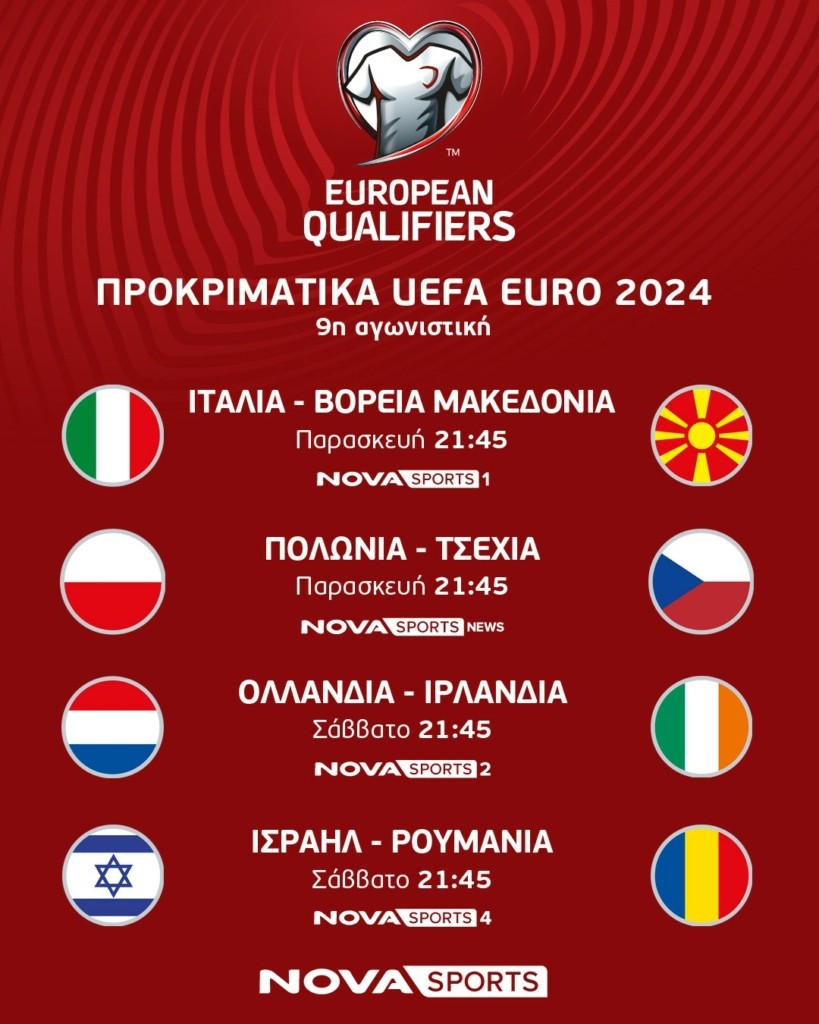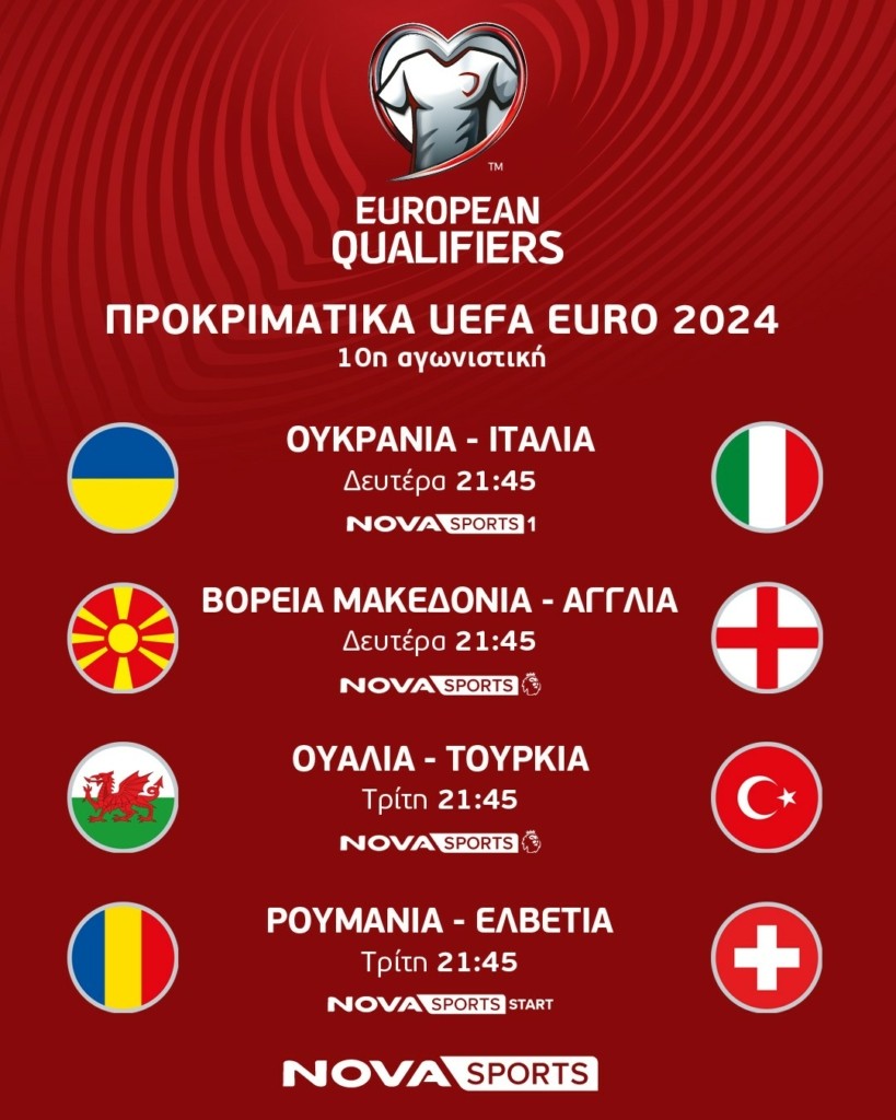 Αθήνα, 15 Νοεμβρίου 2023. Συναρπαστικό θέαμα με τις Εθνικές ομάδες της UEFA στο φινάλε των προκριματικών του Euro 2024 έρχεται αυτό το μήνα στο γήπεδο του Novasports! Από την Τετάρτη 15 Νοεμβρίου έως και την Τρίτη 21 Νοεμβρίου, οι φίλοι της «στρογγυλής θεάς» θα έχουν την ευκαιρία να απολαύσουν μοναδικό ποδοσφαιρικό θέαμα με τις Εθνικές ομάδες και με τα μεγαλύτερα αστέρια του ευρωπαϊκού ποδοσφαίρου με περισσότερες από 50 LIVE αναμετρήσεις!