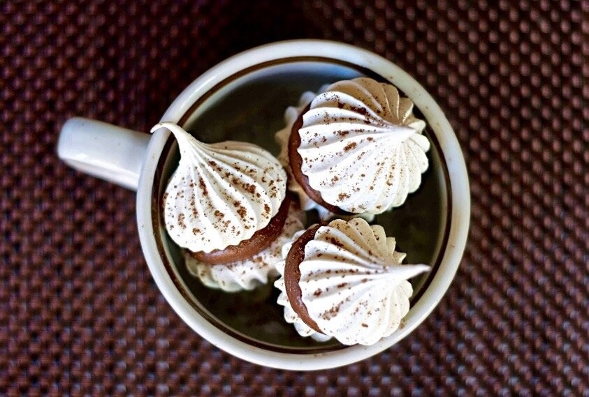 Αέρινες ατομικές μαρέγκες με τραγανό περίβλημα, που λιώνουν στο δάγκωμα, γεμιστές με λαχταριστή γκανάζ σοκολάτας, σαν σάντουιτς. Οι μαρέγκες παραδοσιακά σερβίρονταν σαν κεράσματα σε γιορτές και γενέθλια και ήταν το γλύκισμα που δεν έλειπε σε κάθε τραπέζι γάμου, βάφτισης αλλά και σε κάθε χαρά.