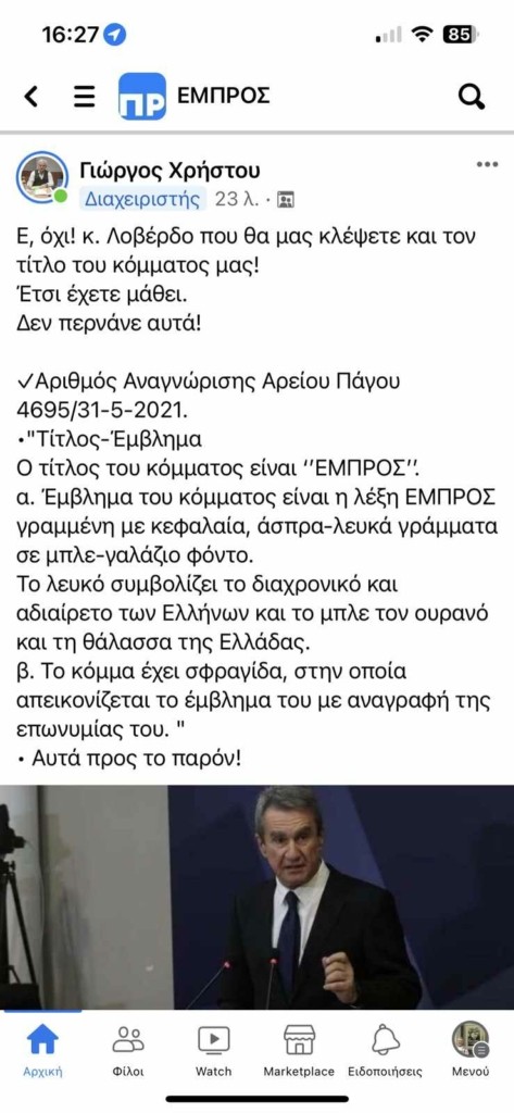 «Ε, όχι κ. Λοβέρδο που θα μας κλέψετε και τον τίτλο του κόμματός μας! Έτσι έχετε μάθει. Δεν περνάνε αυτά!» αναφέρει σε ανάρτησή του ο κ. Χρήστου στο facebook και παραθέτει τον αριθμό αναγνώρισης του τίτλου και του εμβλήματος του κόμματος από τον Άρειο Πάγο.