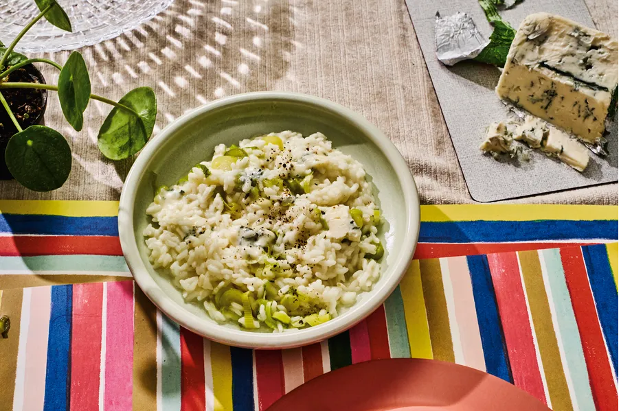 Ένα απλό, κρεμώδες και πολύ γευστικό πιάτο που θα αγαπήσουν μικροί και μεγάλοι και θα γίνει το αγαπημένο σας. Το αγαπημένο ριζότο γλυκαίνει στη γεύση από το πράσο, δροσίζεται ελαφρά από το φρέσκο κρεμμυδάκι και συνδυάζεται ιδανικά με την πικάντικη γκοργκοντζόλα.