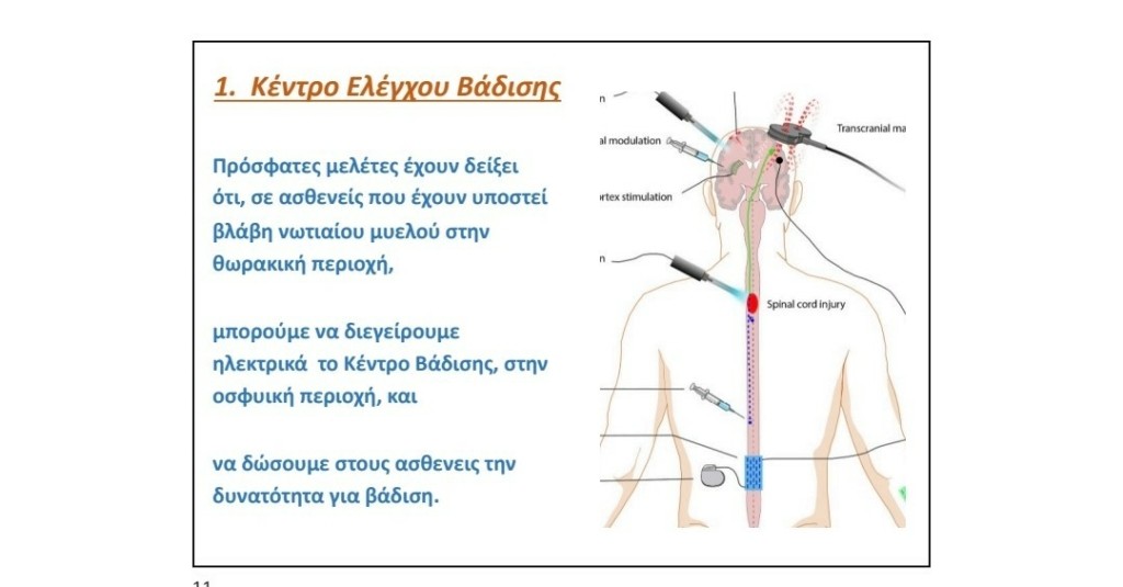 Σε ασθενείς που έχουν υποστεί διατομή του θωρακικού νωτιαίου μυελού, είναι εφικτό να διεγείρουμε χαμηλότερα, στην οσφυική χώρα, το Κέντρο της Βάδισης και να δώσουμε στον ασθενή την δυνατότητα για ένα χονδροειδές, αυτοματικό, ρομποτικό βάδισμα.