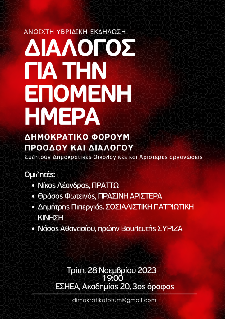 Ανοικτή υβριδική συζήτηση στα πλαίσια του Δημοκρατικού Φόρουμ Προόδου και Διαλόγου, με Δημοκρατικές, Οικολογικές και Αριστερές οργανώσεις.
