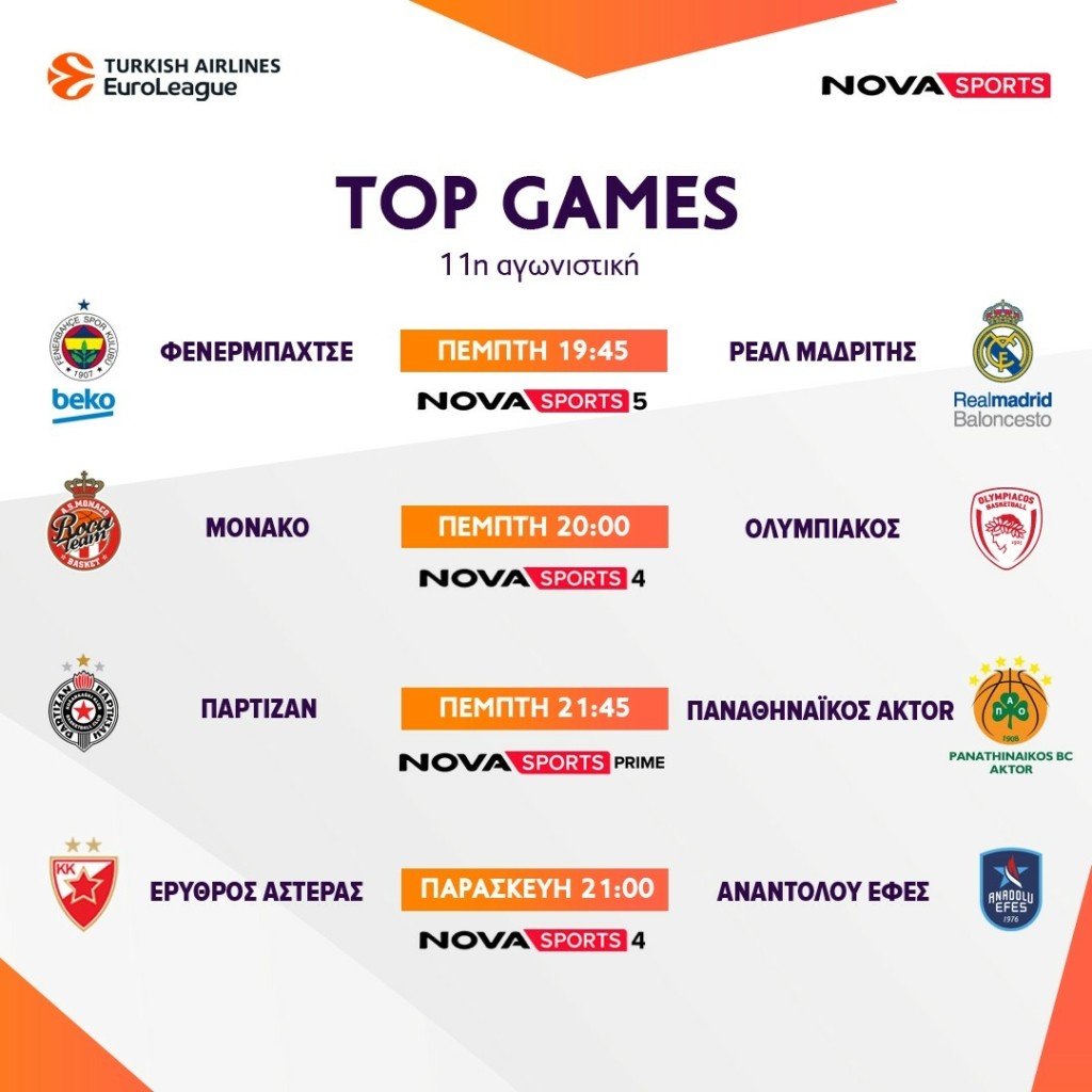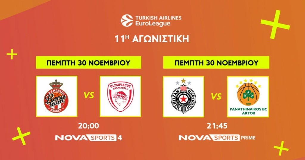 Το μπασκετικό θέαμα στο παρκέ του Novasports με EuroLeague και τους «αιωνίους», με EuroCup και τον Άρη καθώς και με το NCAA συνεχίζεται με αμείωτη ένταση και αυτή την εβδομάδα! Στην EuroLeague, την κορυφαία ευρωπαϊκή διασυλλογική διοργάνωση στο χώρο του μπάσκετ, δεσπόζουν οι αγώνες ελληνικού ενδιαφέροντος Μονακό – Ολυμπιακός (30/11, 20:00) και Παρτίζαν – Παναθηναϊκός AKTOR (30/11, 21:45) στο πλαίσιο της 11ης αγωνιστικής. Παράλληλα, οι φίλοι του μπάσκετ θα απολαύσουν LIVE και όλους τους υπόλοιπους αγώνες της EuroLeague με το ενδιαφέρον να στρέφεται στις αναμετρήσεις Φενέρμπαχτσε – Ρεάλ Μαδρίτης, Μπαρτσελόνα-Βιλερμπάν, Μπάγερν Μονάχου – Βίρτους Μπολόνια, αλλά και στο εξ’ αναβολής παιχνίδι Μακάμπι Τελ Αβιβ – Ρεάλ Μαδρίτης.