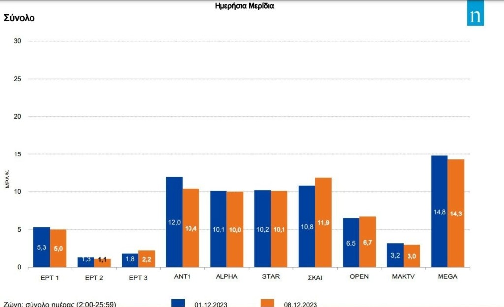 Τα «πάνω» του έδειξε να ξαναπαίρνει το Open, ενώ η ΕΡΤ1 είχε αξιοσημείωτη απώλεια (σχεδόν μιάμιση ποσοστιαία μονάδα) στη δυναμική της από τη μία μέρα στην άλλη. Στην περιοχή του 3% κρατήθηκε το Μακεδονία TV και η ΕΡΤ3 απέσπασε 2,2%. Η ΕΡΤ2 είδε τον δείκτη τηλεθέασης να μετατοπίζεται κατά 0,1% πιο κοντά στον άσσο.