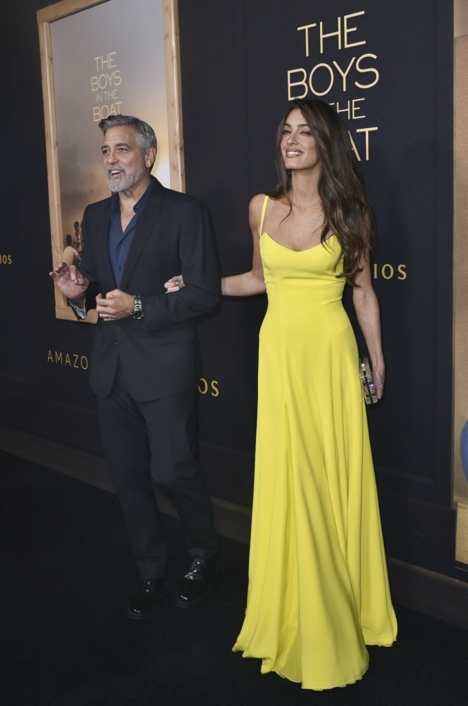Η Αμαλ, 45 ετών, έλαμψε με ένα προσαρμοσμένο φόρεμα Versace, σε έντονο κίτρινο, ενώ ο ηθοποιός φόρεσε ένα κλασικό μαύρο κοστούμι με ένα μπλε πουκάμισο από κάτω.