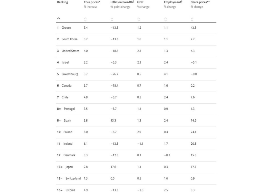 Σύμφωνα με την ανάλυση του Economist που βασίζεται σε πέντε οικονομικούς και χρηματοοικονομικούς δείκτες (πληθωρισμός, «εύρος πληθωρισμού», ΑΕΠ, θέσεις εργασίας και επιδόσεις του χρηματιστηρίου), η χώρα μας έχει και φέτος τους καλύτερους βαθμούς στην οικονομία ανάμεσα σε 35 κυρίως πλούσιες χώρες.