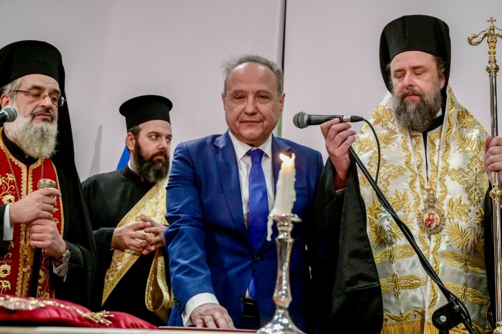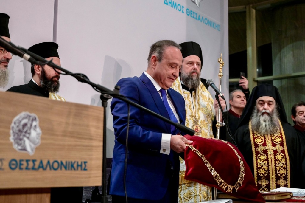 Την oρκωμοσία τέλεσε ο νέος μητροπολίτης Θεσσαλονίκης Φιλόθεος, σ’ έναν κατάμεστο από κόσμο χώρο, με τον κ. Αγγελούδη να παραλαμβάνει από τον προκάτοχό του, Κωνσταντίνο Ζέρβα, το Διάσημο, το πολύτιμο περιδέραιο που φορά ο δήμαρχος στις επίσημες εκδηλώσεις.
