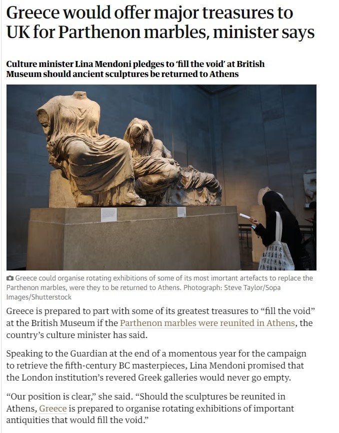 Η Ελλάδα είναι έτοιμη να δανείσει αρχαιολογικούς θησαυρούς της «για να καλύψει το κενό» στο Βρετανικό Μουσείο, εάν τα Γλυπτά του Παρθενώνα επιστραφούν στην Αθήνα, δήλωσε συγκεκριμένα στο βρετανικό μέσο η υπουργός Πολιτισμού.